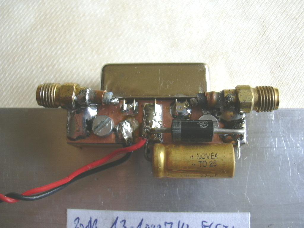 On pouvait trouver ce module à CJ2006. Ce module amplificateur est destiné aux applications CATV. Il est maintenant remplacé par le 2F8723. Tension d'alimentation unique 24 volts, gain de l'ordre de 22 dB, capable de fournir plus de 100 mW, et bien qu'étant adapté 75 ohms, si l'on accepte une dégradation de l'adaptation, il peut rendre de grands services dans des applications d'amplification large bande ou lorsqu'on a besoin de "booster un OL" . En effet, il est utilisable de 20 à 1000 MHz, voire 1300 MHz en ne de dépassant pas 0 dBm en entrée. Sa mise en oeuvre est on ne peut plus simple, une entrée, une sortie,
