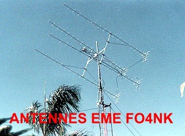 F6ETI's LUNAR STORY Octobre 1982 : entendu premiers signaux EME sur 144 MHz avec 2x16 éléments à l'horizon: WA1JXN/7, K1WHS. Tenté sked avec K1WHS le 11/10/82 et l'ai entendu m'appeler ... 1983, A.G. de Valence, visite de la station de F1FEN/07. Ecoute de la lune avec 4x16 elts, plusieurs stations entendues en CW, ça met l'eau à la bouche! Avril 1989: premiers essais 432 MHz EME depuis Papeete chez FO4NK, première EME depuis Tahiti : QSO avec DL9KR (qui a "écrasé" F6CGJ, mais la fenêtre était tellement courte) avec 4x21 élts + 500W. Participé à l'ARRL EME 1989 chez F1FHI: premier mondial sur 432 MHz multiops (F1FHI F1NWK F6ETI). 199x: récupération d'un gros réducteur 1/56. Il devrait pouvoir servir un jour à faire tourner un système d'antennes EME. Mai 1990 "expédition" EME 432 MHz chez FO4NK avec F5FHI. La station est maintenant opérationnelle et "crédible" (dixit F5FHI). 4X21 élts + 800W (ampli 3CX800 F8SQ). 34 QSO complets avec 29 stations différentes sont réalisés. F5FHI (ex F1FHI) est décédé le 16 mai 2011, F5FFT (ex FO4NK) est décédé le 13 novembre 2011 Compte-rendu des deux expéditions dans Radio-REF ARRL EME